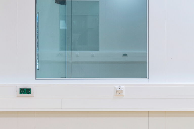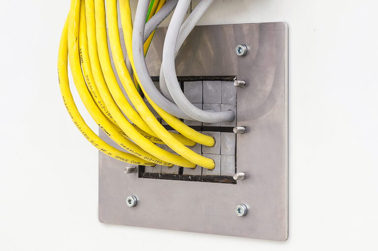 Reinraumkonforme, luftdicht abschließende Kabeldurchlässe an der Außenseite eines Reinraumes.