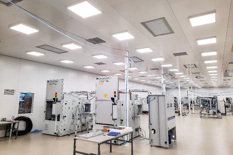 Reinraum der Klasse ISO 4 mit Belüftungsanlage und Stahlkonstruktion.